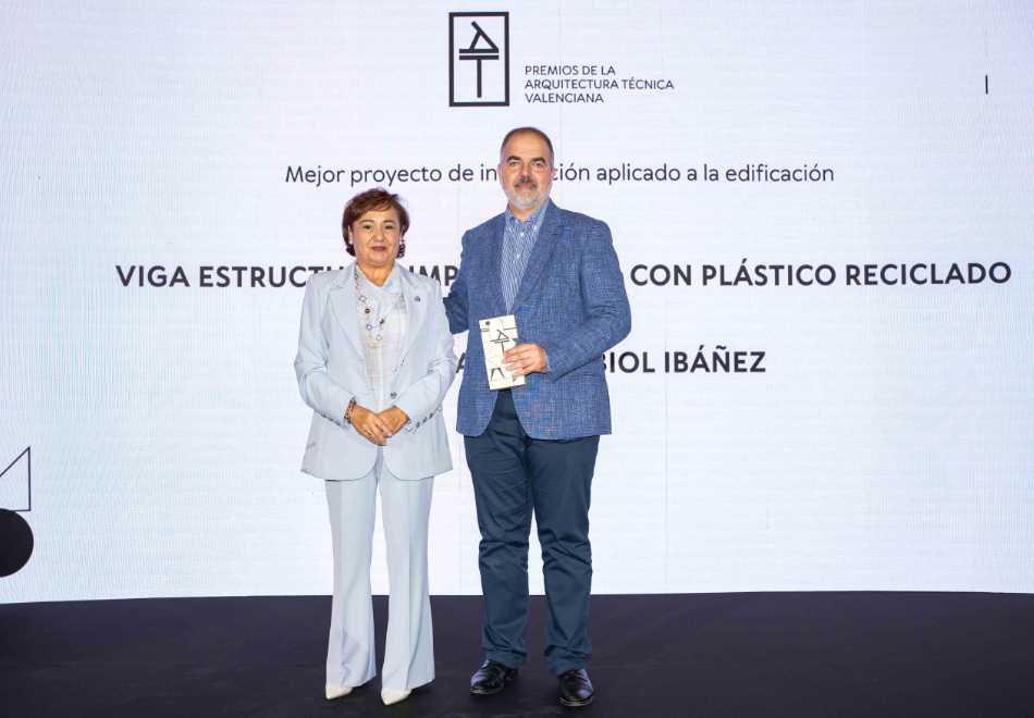 El Mejor proyecto de innovación aplicado a la edificación, el jurado ha galardonado la viga polimérica presentada por el arquitecto técnico José Ramón Albiol Ibáñez. Se trata de una viga estructural impresa en 3D con plástico reciclado, desarrollada por un equipo de investigación en el marco de la UPV. En palabras del jurado, «liderando un equipo multidisciplinar, ha desarrollado una solución estructural innovadora, en constante evolución, que combina impresión 3D, materiales reciclados y diseño segmentado para revolucionar la ejecución de elementos en obra. Inspirada en la estructura ósea humana, esta viga ligera, resistente y fácil de montar abre nuevas posibilidades hacia una construcción más limpia, industrializada y sostenible».