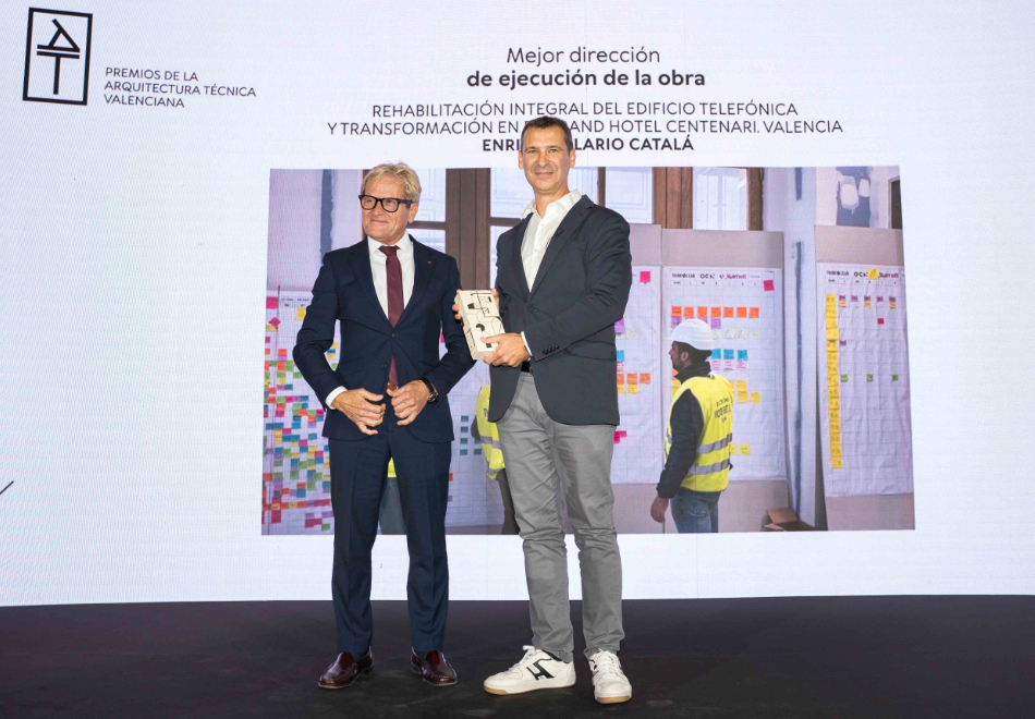 El arquitecto técnico Enrique Alario Catalá ha recibido el premio en la categoría de Mejor dirección de ejecución de la obra (Premio Musaat) por la rehabilitación integral y la adecuación para uso hotelero del que fue el antiguo edificio de Telefónica en la Plaza del Ayuntamiento y es hoy el Grand Hotel Centenari by Marriot. La obra supuso un auténtico reto en un edificio en desuso y en camino de la degradación, aunque con un alto grado de protección patrimonial que condicionó el diseño y la toma de decisiones tanto en fase de diseño como de ejecución, en un emplazamiento logísticamente complicado, con unos plazos muy ajustados, y unas altas exigencias técnicas y de calidad que precisaba de un gran equipo humano para poder hacerlo posible.
