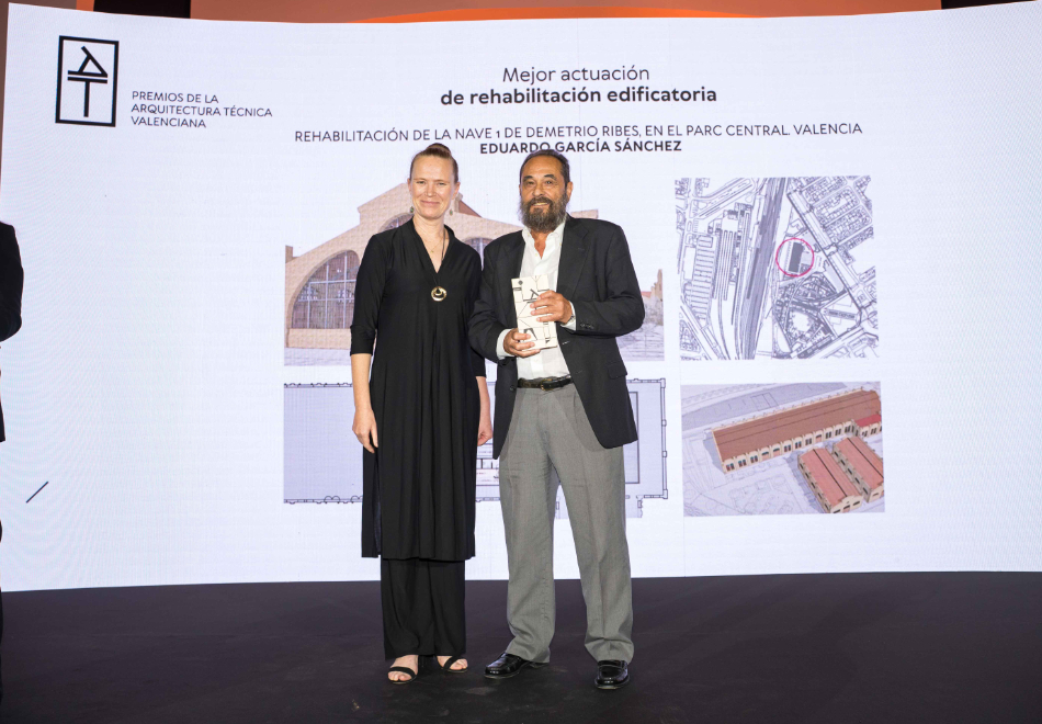 En el Parque Central de Valencia, Eduardo García Sánchez es el arquitecto técnico que ha dirigido la ejecución de la habilitación para centro deportivo de la Nave 1 en el Parque Central de Valencia. Se trata de una de las siete naves de Demetrio Ribes, construidas entre 1911 y 1915 como parte de las instalaciones ferroviarias de la Estación del Norte. La compatibilidad de la adecuación para su uso deportivo con el respeto al bien patrimonial ha protagonizado esta intervención que se ha alzado con el premio a la Mejor actuación de rehabilitación edificatoria.