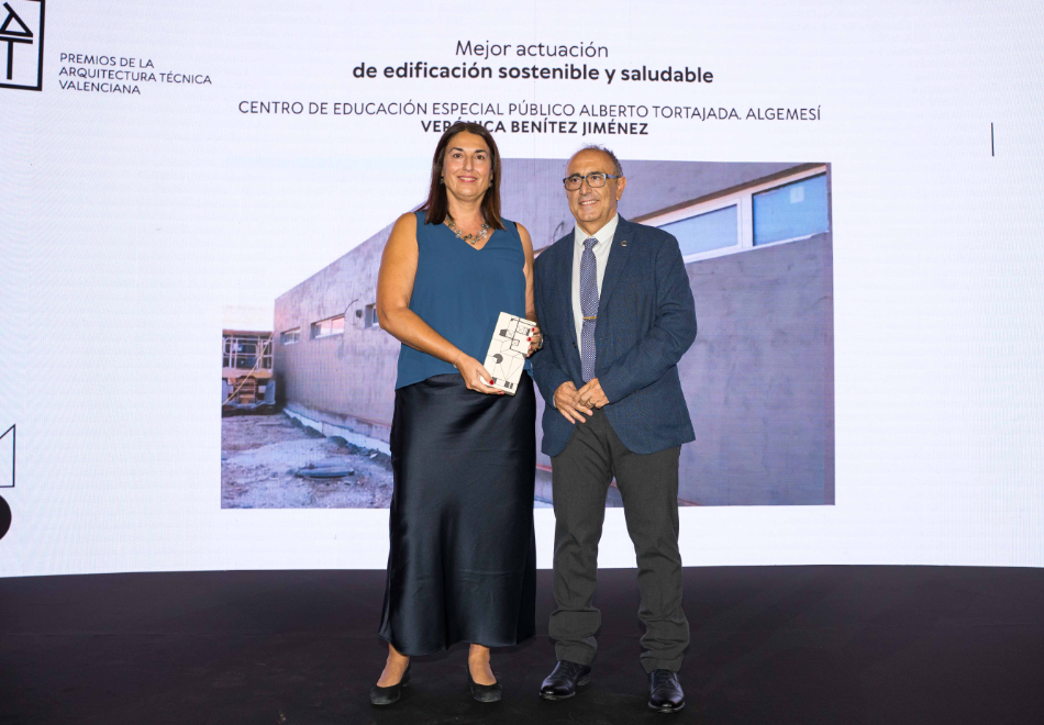 La arquitecta técnica Verónica Benítez Jiménez ha resultado galardonada en la categoría de Mejor actuación de edificación sostenible y saludable con el Centro de Educación Especial Alberto Tortajada, en Algemesí. Es el primer colegio público de España que cumple con los estándares Passivhaus, lo que implica una drástica reducción de la demanda energética, una calidad ambiental interior garantizada, confort térmico y acústico y un mínimo impacto ambiental.